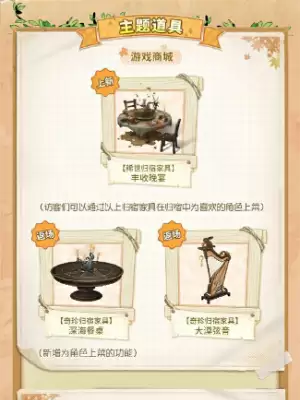 往期活动限定道具【奇珍归宿家具】深海餐桌、【奇珍归宿家具】大漠弦音将在游戏商场返场,【独特归宿家具】红枫地毯将在活动商城返场,访客们可以抓住此次机会,选购心仪的家具!