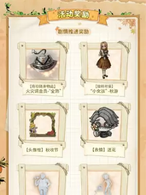 访客们参与活动,完成指定任务,即可获得【奇珍随身物品】火灾调查员-“全熟”、【独特时装】“小女孩”-秋游、【奇珍归宿家具】石榴树盆栽、【独特归宿家具】便携餐盘、头像框、头像、表情、个性动作、归宿音乐、菜品等奖励。