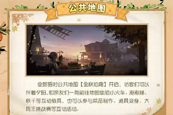 全新限时公共地图【金秋拾趣】开启,访客们可以伴着夕阳,和亲友们一同前往地图体验小火车、滑滑梯、秋千等互动载具,也可以参与菜品制作、道具变身、大胃王挑战赛等互动活动。