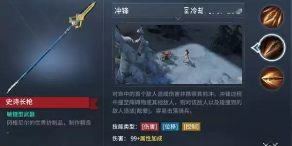 前戳向目标方向攻击,并对命中的敌人造成伤害,被长枪尖端命中的敌人造成更高的伤害,并被减速。