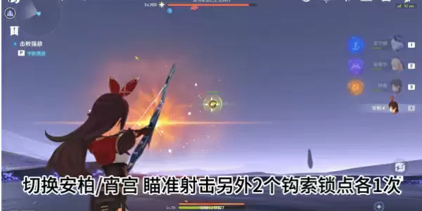 2、蛇姬钩索第一个锁点后会进入飞悬状态,我们跟随其更换钩索锁点,前往其脚下躲避伤害,然后使用火属性弓箭角色将钩索射落。