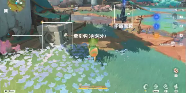 5、前往牵引钩(树洞外),和机关交互“安装牵引钩”,然后使用匿叶龙战技,拉拽1次牵引钩(树洞外);最后等待一会就可以获得一个华丽的宝箱,然后和旁边黑色巨石交互“触碰”进入夜魂试炼中。