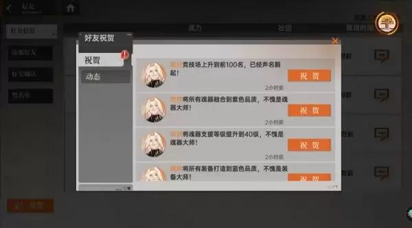 4、添加好友后就可以相互交流了,还可以通过好友祝贺来获得体力奖励