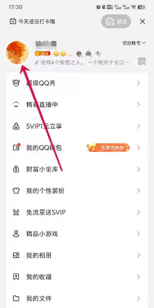 1、打开QQ后,左滑进入个人信息界面,然后点击左上角的QQ头像。