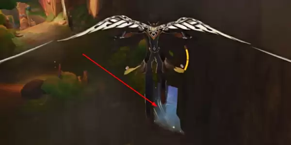 来到回声之子部落右侧的地下传送锚点,如下图所示,出传送锚点后,向后转打开风之翼飞到下图标记的位置,使用石环打开屏障,拿完里面的奖励。