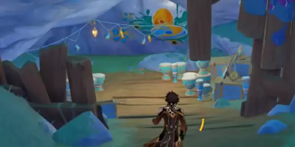 打开地图传送到流泉之众部落上方的传送锚点,位置如下图所示,然后往地图西南方向移动,在海滩边的一处洞穴旁使用石环打开屏障,拿完其中的探索奖励。