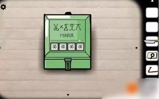 箱子上写着“MIRROR”,英文“镜子”的意思,所以上面的乱码字样是镜像左右对称的,除了第二个"x"为乘号,其余乱码可以得出为数字“6”,“2”,“3”,“7”,所以答案为6x237,等于1422,能得到一块宝石。