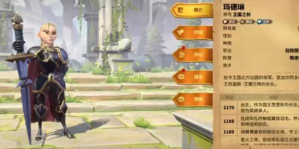 玛德琳是步兵系英雄,能在前方承受超高伤害,她的主动技能获得物理锐利效果,让接下来的4秒内物理攻击力提升20%并获得一个护盾,这个护盾能在接下来的四秒内为部队吸收一定伤害。