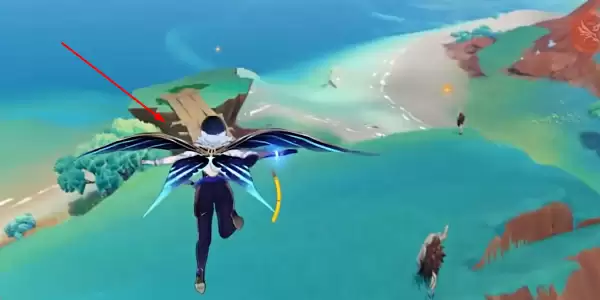 2、离开传送锚点后打开风之翼往南方向飞,我们可以在前方两个小山体之间发现一座木桥,如下图所示。