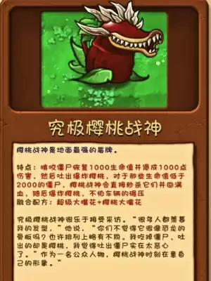 融合配方超级大嘴花+樱桃大嘴花特点啃咬僵尸恢复1000生命值并造成1000点伤害,然后吐出爆炸樱桃。