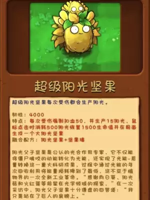 融合配方阳光坚果+坚果墙特点每次受伤强制扣血50,并生产15阳光,鼠标点击时消耗500阳光恢复1500生命值并在前面生成一个大阳光坚果。