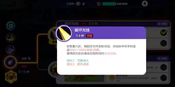 短暂蓄力后,朝指定方向发射光线。光线命中对手时造成300(+160%攻击)伤害。使用该招式后自身会在短时间内无法动弹。