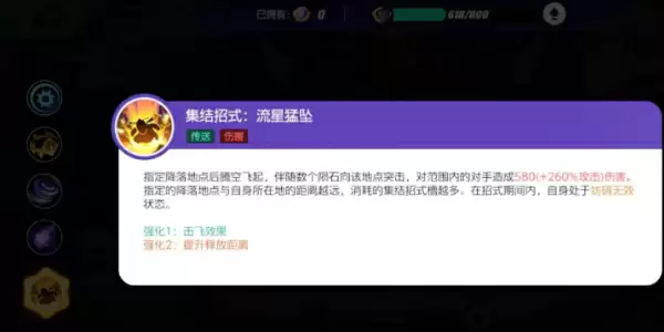 指定降落地点后腾空飞起,伴随数个陨石向该地点突击,对范围内的对手造成580(+260%攻击)伤害。