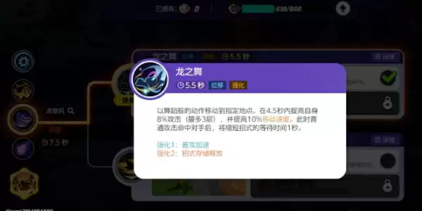 以舞蹈般的动作移动到指定地点。在4.5秒内提高自身8%攻击(最多3层),并提高10%移动速度。此时普通攻击命中对手后,将缩短招式的等待时间1秒。