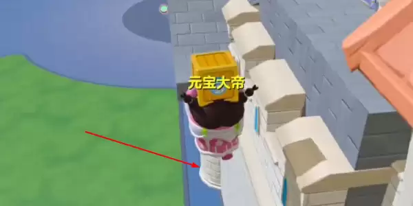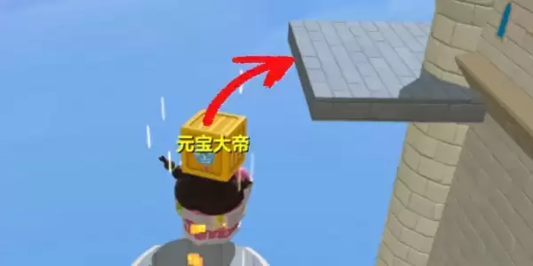 5、接着我们需要在下图蛋仔的脚底下垫一个木箱,然后跳扑到前方的台阶上。