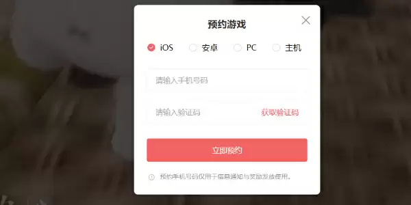 2、然后在弹出的窗口中选择自己预约的机型,可以是ios、安卓、pc、主机,也可以多选;然后再输入自己的手机号码,并填写验证码就可以完成预约了。