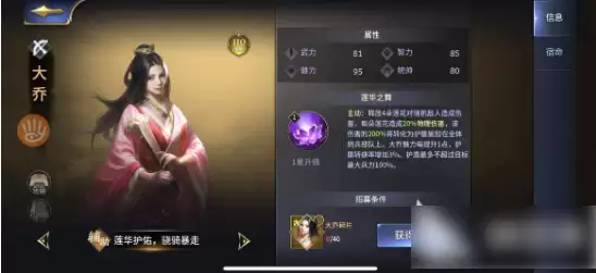 大乔和鲁肃的效果差不多,都是给自己的队伍提供护盾加成,但是大乔不同的是她的盾数值更厚,但是不是全体,而是对骑兵进行护盾值的加成,主玩骑兵的玩家可以搭配一个大乔。