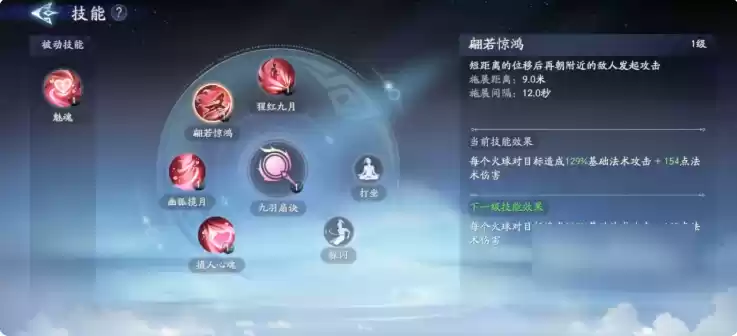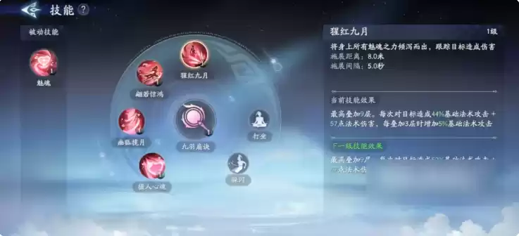 首先来看一下妲己的普攻技能,九羽扇诀,它是属于远程穿透攻击,四式连招能够对路径上敌人造成伤害。随着技能等级提升,造成的基础伤害和固定法术伤害都有所增加。第1个主动技能猩红九月,将妲己身上所有的魅魂之力倾泻而出,跟踪目标造成伤害。该技能使用的时候最多可以叠加九层,每一层都能够对目标附加基础法术攻击和固定法术伤害,每叠加三层,还有额外基础法术攻击加成,如果叠加到最高层。技能打出的伤害是非常可观的。