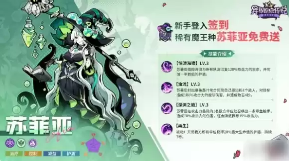 1、苏菲亚是一位签到就送的辅助角色,本身自带回复、加盾、控制。