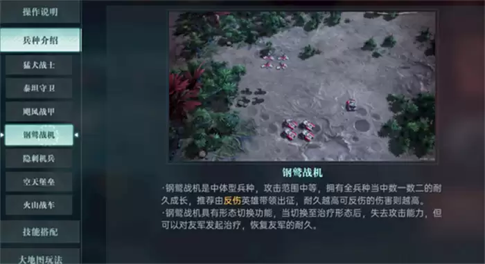 以同为中体型的两个兵种“飓风战甲”“钢鹫战机”为例,飓风战甲可以切换形态至空中形态,该形态可以无视地形飞越部分山脉以及峡谷,提供无可比拟的机动性。而钢鹫战机可切换为治疗形态,以失去攻击能力为代价,恢复友军耐久,是战场不可或缺的“军医”。