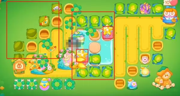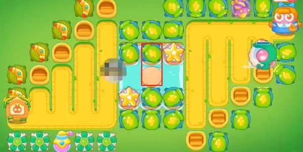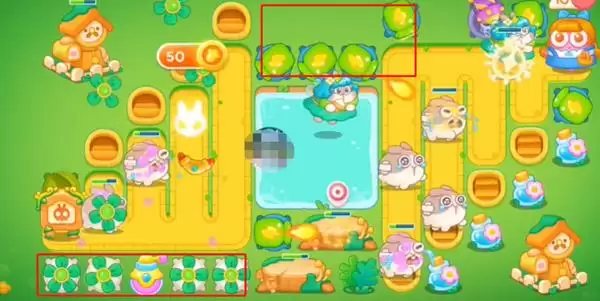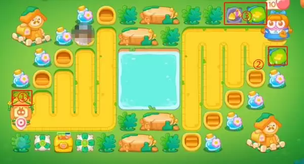 3、及时清理掉水中的宝箱,会有星星炮台,后面怪物集中比较少,增加单体伤害即可,而且还要及时清理道具,中间水池可以多放瓶子炮。