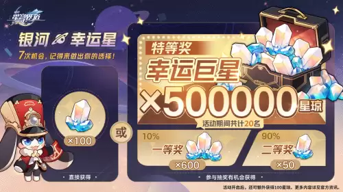 从春节当周的周一开始,玩家们连续七天,每天都可以在“稳拿100星琼”与“参与抽奖”之间抉择,一旦被抽中成为幸运“春节锦鲤”,你就可以拿到50万星琼的超级奖励,就算没抽中,你也能拿到600或50星琼的保底奖励。