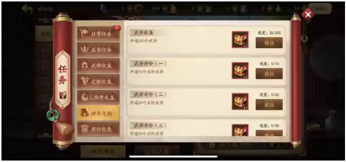 获取神将卡的第二种方式就是通过神武宝箱获取,在日常任务页面有一个神将兑换的板块,玩家每完成一个收集任务就会获得一个神将宝箱,打开之后就可获得一个未拥有的神将卡了,这些收集任务包括武将升级,武将升阶等等,打开宝箱之后,如果人家已经拥有了所有的神将将,则会自动转换为10000个功勋。
