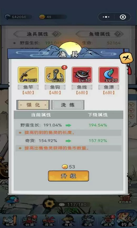 5、通过完成垂钓目标提交相应的垂钓物,获得夜明珠,夜明珠可以用于升级渔具。渔具升级以后,可以适应更多高级的鱼灵所需的渔具属性、