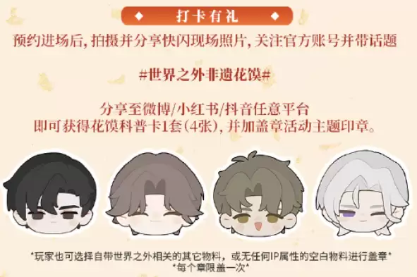 预约进场后,拍摄并分享快闪现场照片,关注世界之外最新账号并带话题#世界之外非遗花馍#分享至微博/小红书/抖音任意平台,即可获得花馍科普卡1套(4张),并加盖章活动主题印章。