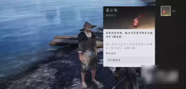 回到岸边再次对话渔夫,他要求你给一个【暮云佩】,这个只要探索度达到40%就能在地图探索度奖励中领取到。这样操作后就能在游戏中使用轻功这些技能了。