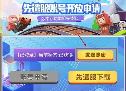 申请成功的玩家按钮将会提醒“已获得”,点击“发送账密”即可将先遣服账号密码发送到正式服游戏内邮箱。