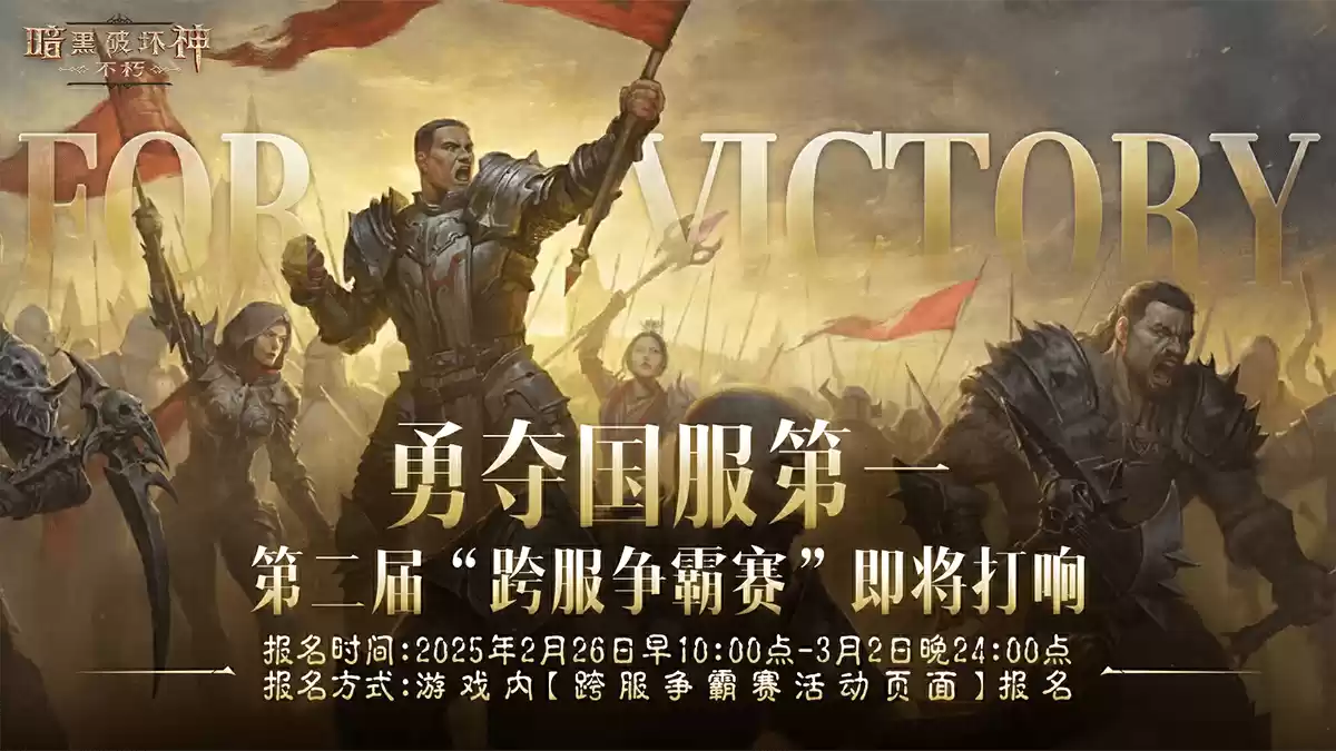 昔日的传说尚未远去,新的篇章已悄然展开!战火重燃,荣耀再临——《暗黑破坏神:不朽》第二届跨服争霸赛即将震撼开启!全服顶尖强者集结,跨服对决,巅峰碰撞!无论你是历经沙场的传奇战神,还是初露锋芒的无畏新锐,这片战场都将成为你证明实力的舞台,每一场胜利都将是你加冕道路上的基石!你,准备好迎接这场史诗级的对决了吗?2月26日报名开启,加入战斗,赢取属于你的不朽荣耀,新的传奇将由你书写!