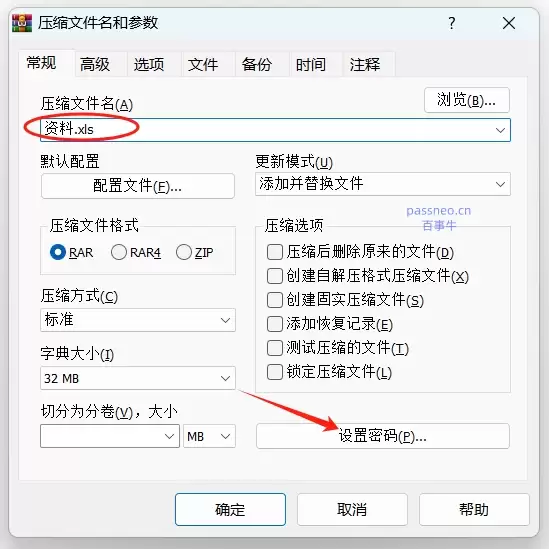 弹出“压缩文件名和参数”对话框后,修改“压缩文件名”中的后缀,然后点击“设置密码”选项进行设置即可。