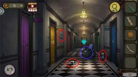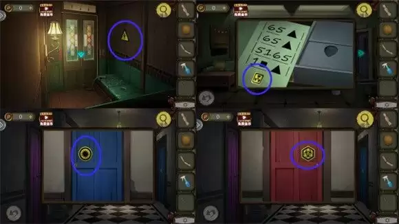 根据警示线索,打开柜子拿到人偶右腿。组合人偶,拿到蓝色钥匙,打开蓝门。