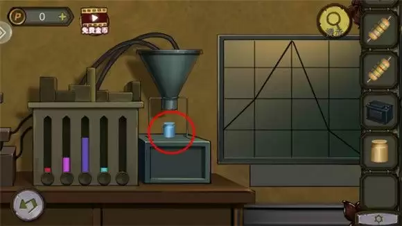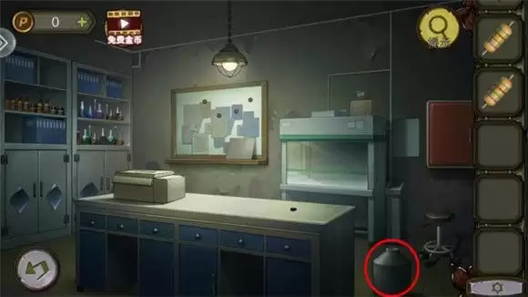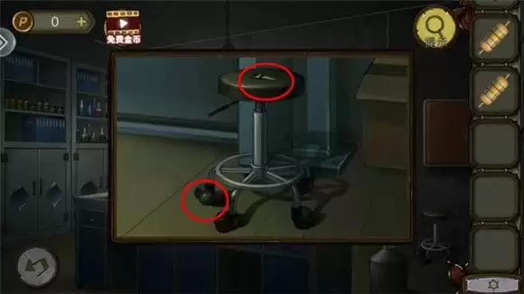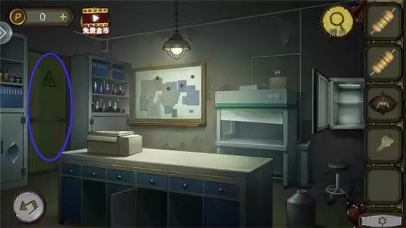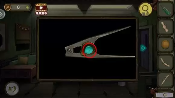 碘酒喷在黑板上,根据黑板上的图,打开柜子拿到半个钳子。
