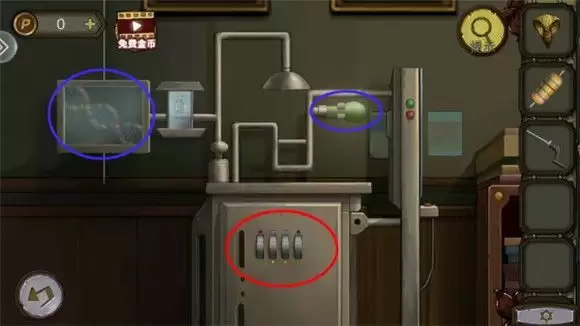 桌上拿到开关,机器装上开关,拿到扳手和金属片。