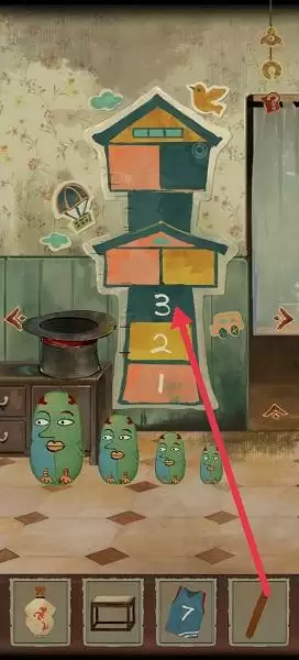 15、接着我们去厨房架子上拼好七巧板,把七巧板拼成6拖到6格子上,魔术帽变出瘪掉篮球7号球衣是之前拿剪刀剪开枕头获得的。