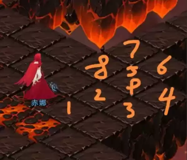 按下图位置来到十字最上面,面向上方→↑→↑←↑←↓→的方向走位,要把地板铺好。