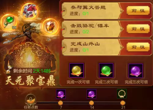 天元聚宝鼎:完成任务即可解锁随机奖励,完成任务越多,可获得的奖励越好,累计完成指定数量任务,解锁绝版奖励!