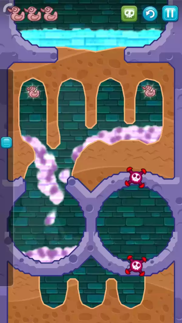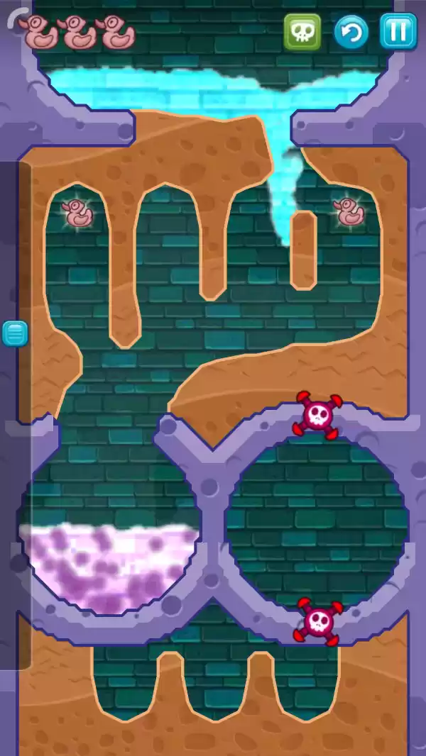 然后就可以进行清水的分流了。将上方清水池下方的泥土去掉,水流经过右侧的鸭子。之后,将右侧炸弹上方的清空,水流经过,炸弹爆炸,打通右侧的圆形蓄水池。