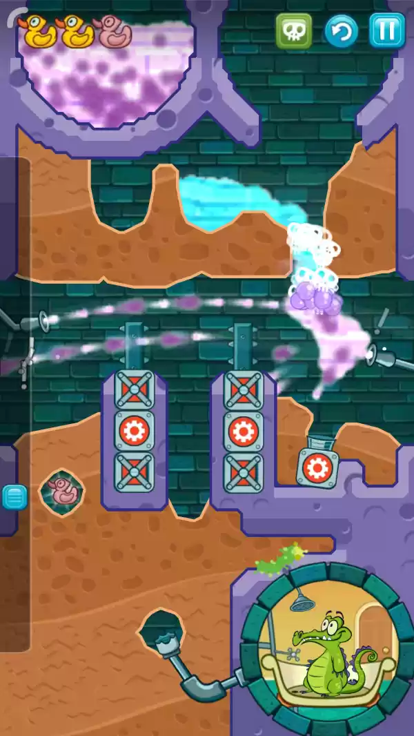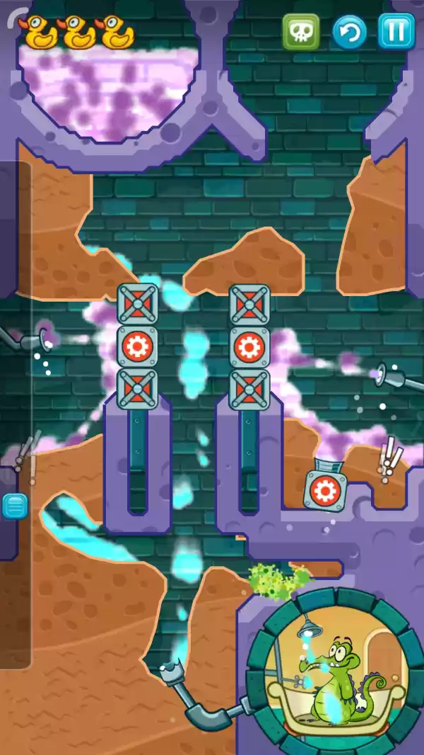 玩家需要通过分流脏水和干净的水,并且在游戏后期将脏水以截留的形式阻隔,防止清水混入其中,从而清水引入到小鳄鱼的浴室中。