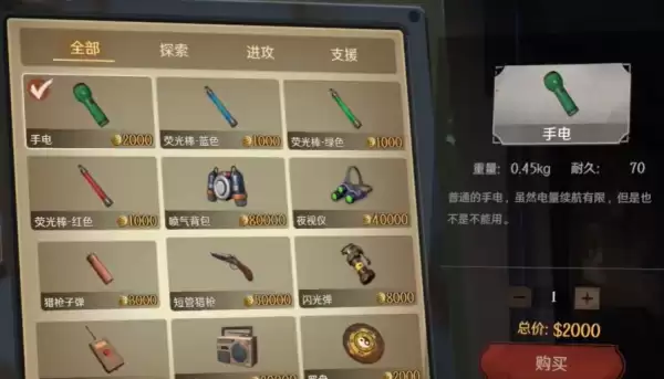 1、手电筒是可以在商店购买得到也可以在地图中探索得到的道具。