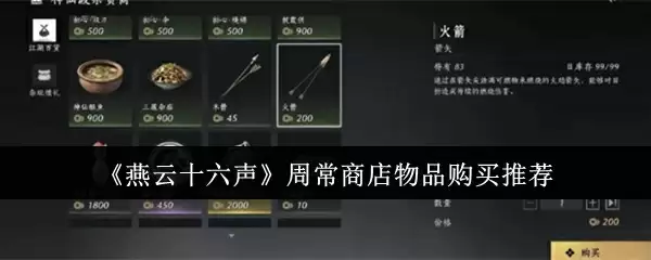 燕云十六声周常商店物品怎么购买?在燕云十六声中,每周商店都会刷新一些重要物品,玩家可以根据自身需求购买。以下是每个商店的必买物品推荐,帮助你更好地利用每周的限购机会,希望能够帮助到你。