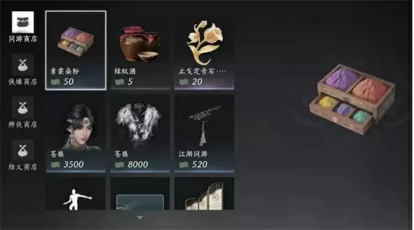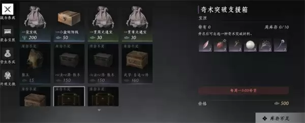 战斗养成店铺:购买心法心得、武学自选心得、奇术突破支援箱、生活物质支援箱等。