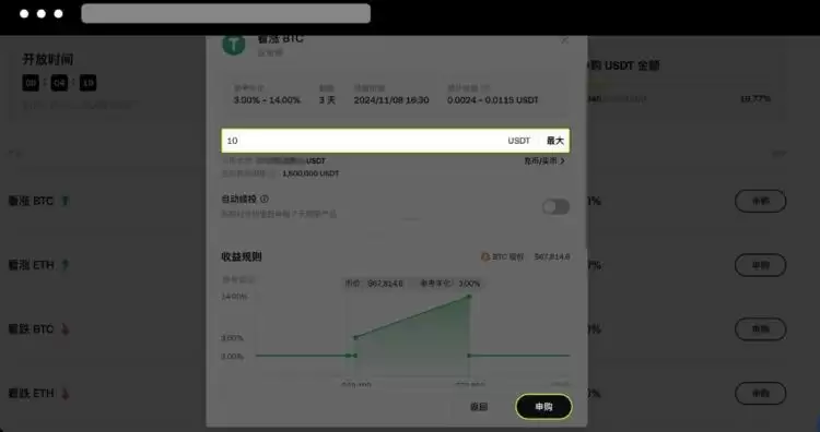 11、打开后,选择你喜欢的产品(看涨/看跌BTC/ETH),并在申购期内认购。