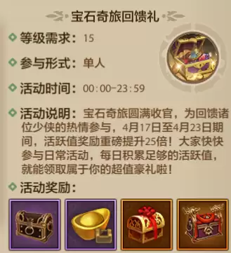 喜大普奔,喜大普奔!天上真的掉馅饼了,白嫖好礼又来啦,为庆祝宝石奇旅圆满收官,回馈诸位少侠热情参与,在4月17日至4月23日期间,等级不低于15级的少侠,活跃值奖励重磅提升25倍!