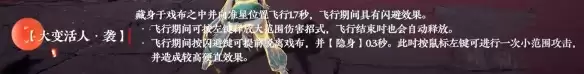 飞行期间按闪避键可提前脱离戏布,并【隐身】0.3秒。此时按鼠标左键可进行一次小范围攻击,并造成较高硬直效果。