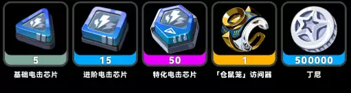 基础电击芯片*5、进阶电击芯片*15、特化电击芯片*50、「仓鼠笼」访问器*1、丁尼*500000。