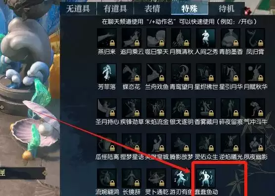 3、找到表情【蠢蠢鱼动】,在雕像旁边使用这个动作即可收回赐福;