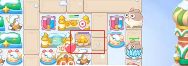 2、进入关卡后直接就有三个吸铁石炮塔,然后往中间放一个火堆。